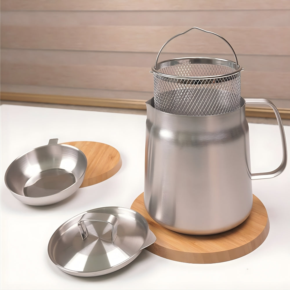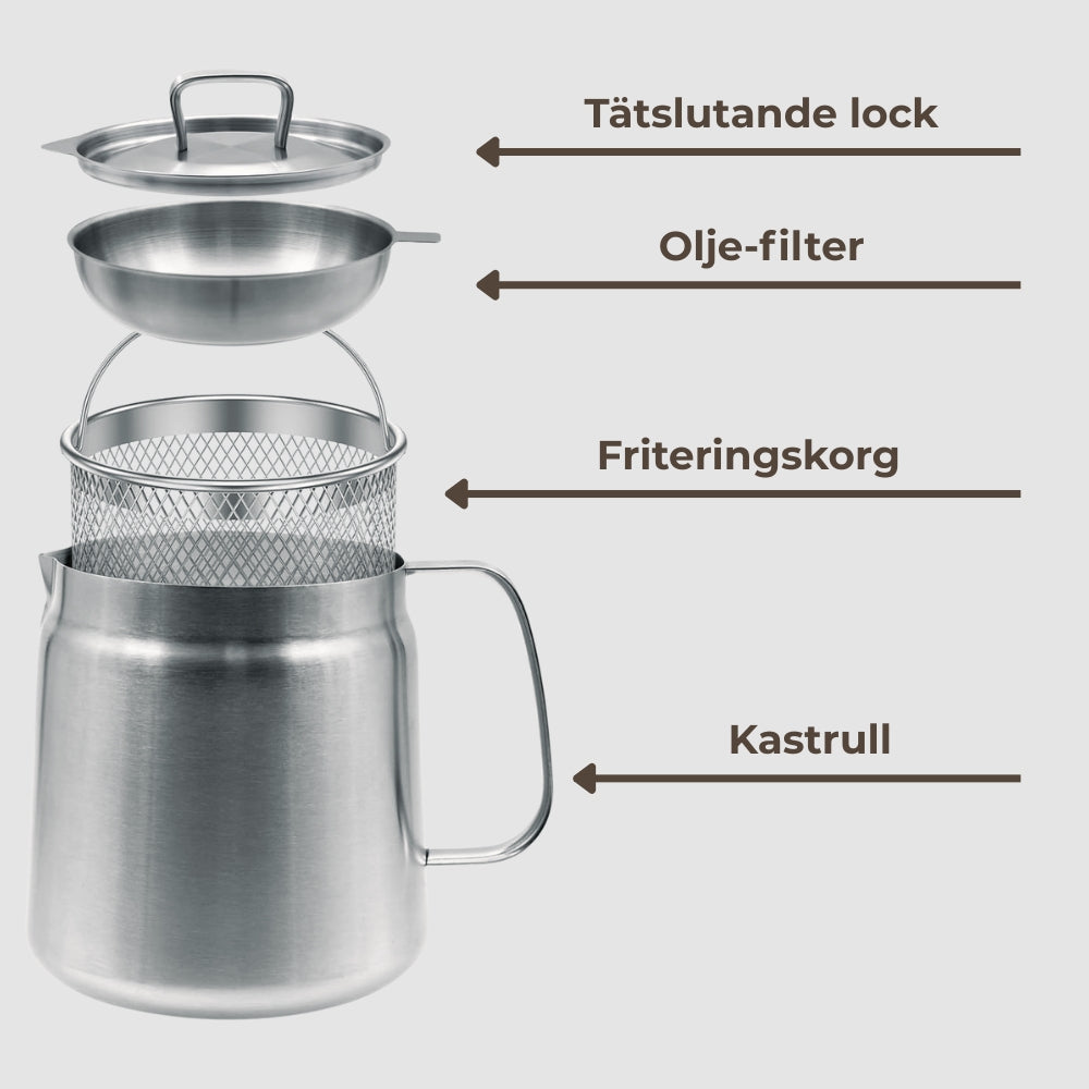 Multifunktionell fritös i rostfritt stål som kombinerar design, funktion och hållbarhet. Med en kapacitet på 2 liter och en stilren borstad finish är den både praktisk och elegant i köket. Den finmaskiga silen kan filtrera bort matrester och hålla oljan ren för återanvändning, för dig som vill laga mat med kvalitet och omtanke.